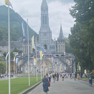 Then round the corner is the grotto where the Virgin Mary appeared to teenage girl Bernadette Soubiros in 1858. There was a queue of people filing through the grotto saying their prayer and perhaps asking for a miracle. There was a large amount of people in wheelchairs to be wheeled through. There were groups led by banners on their way to the grotto.